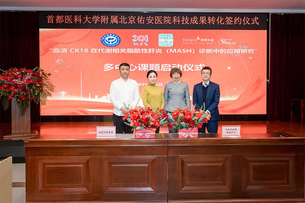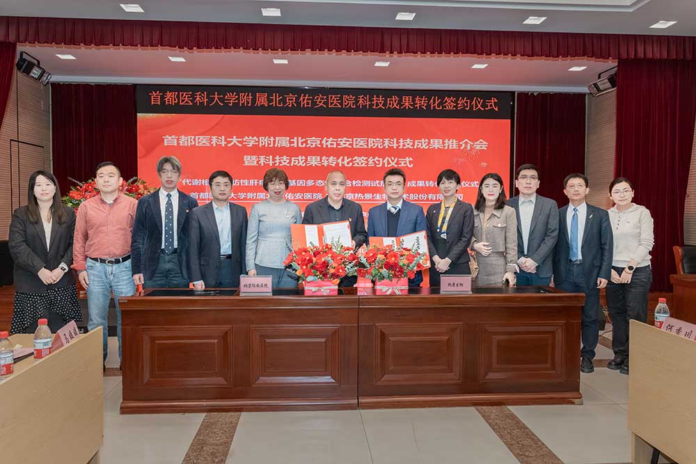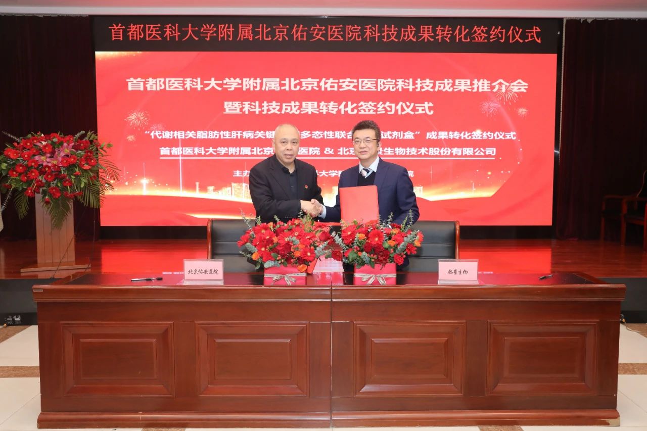 馬迎民院長代表我院與大興區(qū)上市企業(yè)(九游J9)真人游戲第一品牌生物就肝病中心三科張晶主任主導(dǎo)研發(fā)的“代謝相關(guān)脂肪性肝。∕AFLD)關(guān)鍵基因多態(tài)性聯(lián)合檢測試劑盒”簽訂轉(zhuǎn)化協(xié)議。