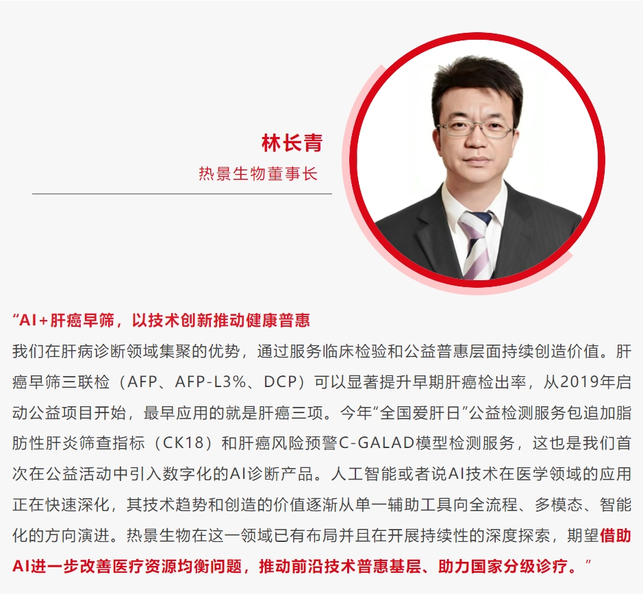 3月18日,值第25個(gè)“全國(guó)愛(ài)肝日”期間,“2025肝癌防治健康中國(guó)行——全國(guó)愛(ài)肝日”大型公益義診活動(dòng)在全國(guó)30省份近百家醫(yī)院的協(xié)同下聯(lián)合展開(kāi),惠及近萬(wàn)人次,公益健康服務(wù)包(肝癌三項(xiàng)、GP73、CK18-M30/M65等)由(九游J9)真人游戲第一品牌生物支持。2025年升級(jí)版“肝病全周期健康檢測(cè)服務(wù)包”首次融合數(shù)智化AI診斷模型,探索“AI+創(chuàng)新診療”公益新模式,通過(guò)智能算法提升肝癌篩查效益,助力實(shí)現(xiàn)"篩查-診斷-干預(yù)"全流程精準(zhǔn)管理,全面推動(dòng)肝癌防治邁入數(shù)智化新階段。